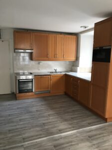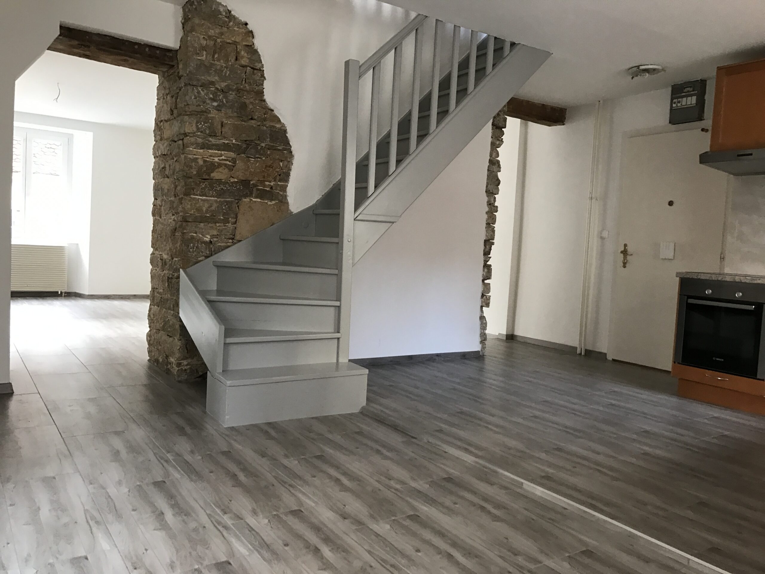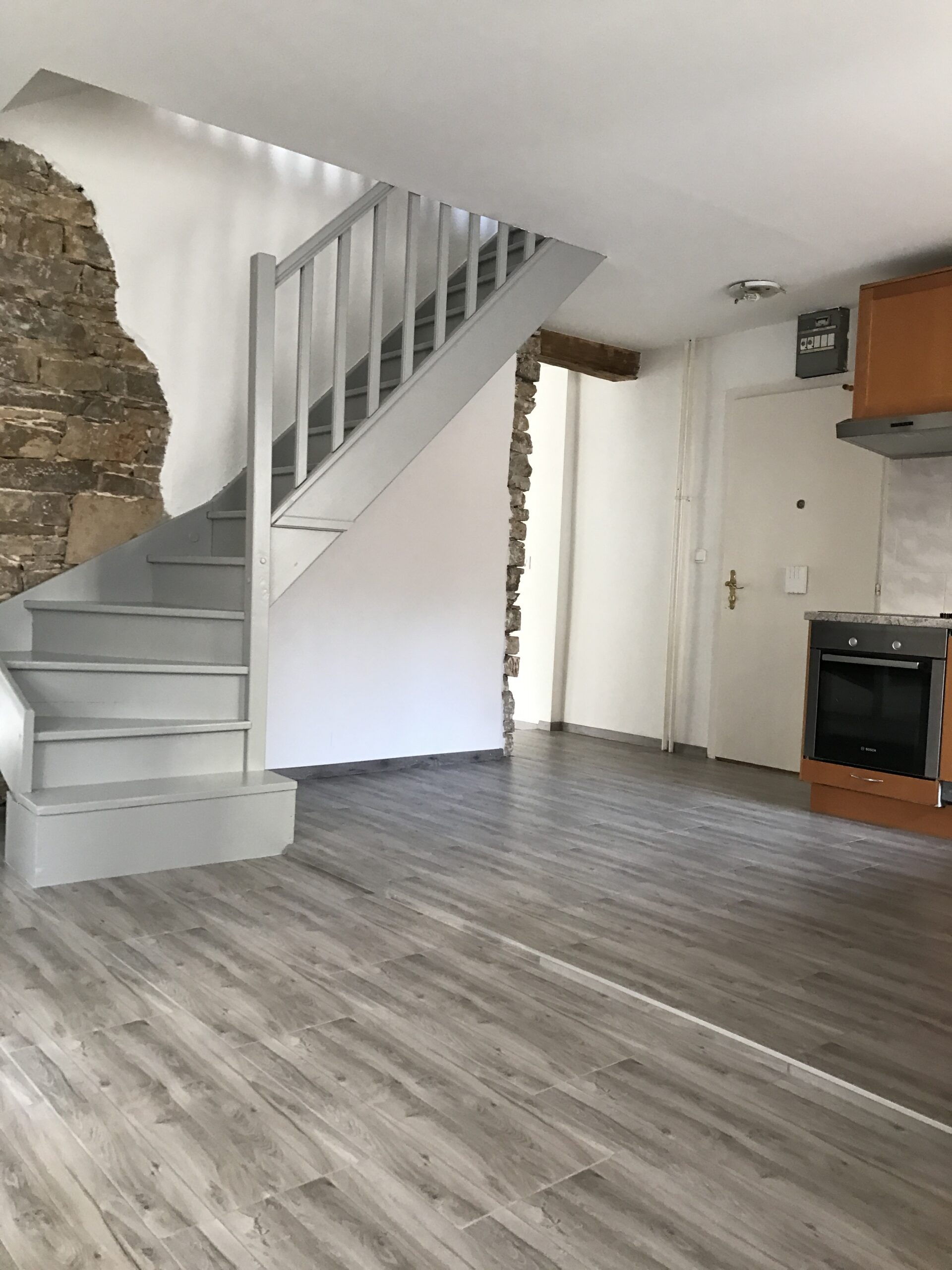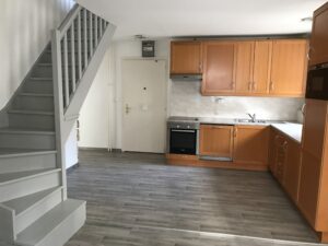 Duplex comprenant une cuisine agencée, un séjour, 2 chambres, 1 salle de bains, 1 salle de douche et une cave.