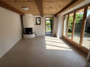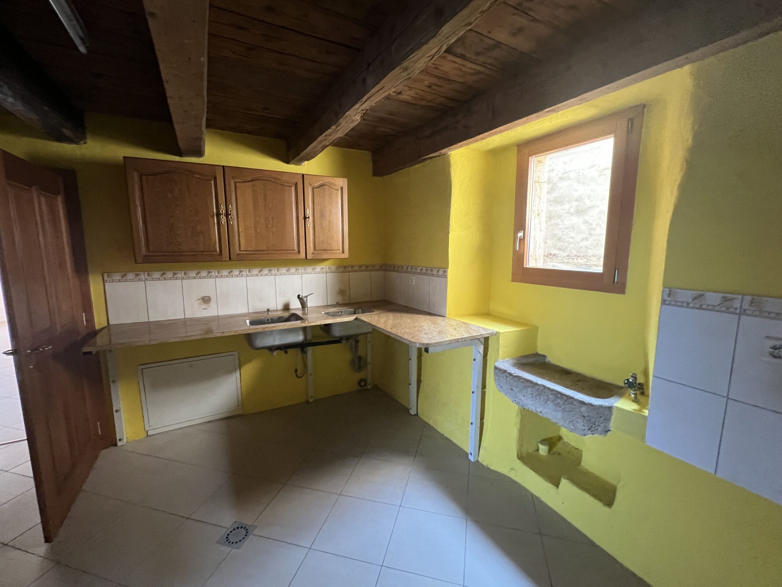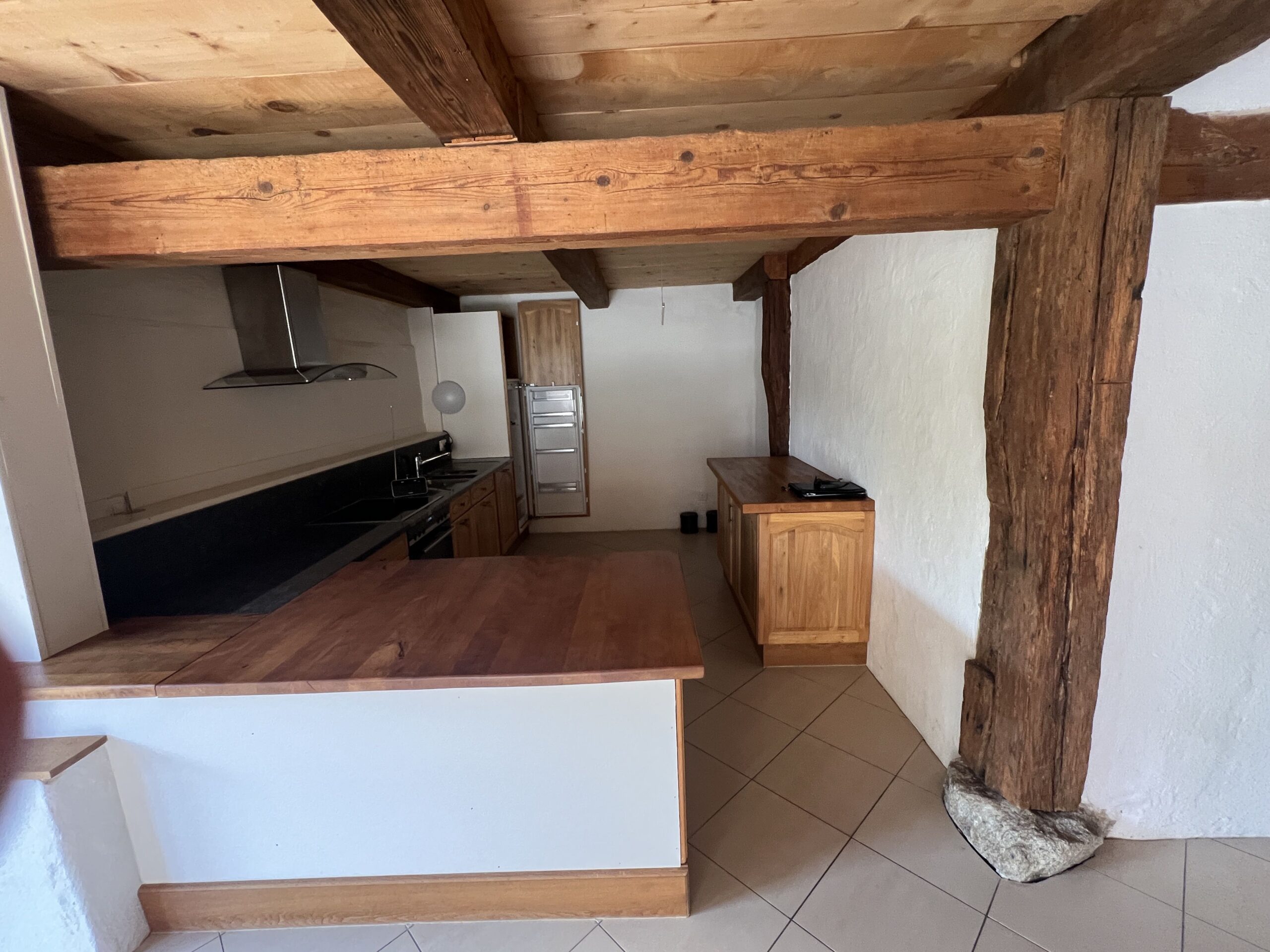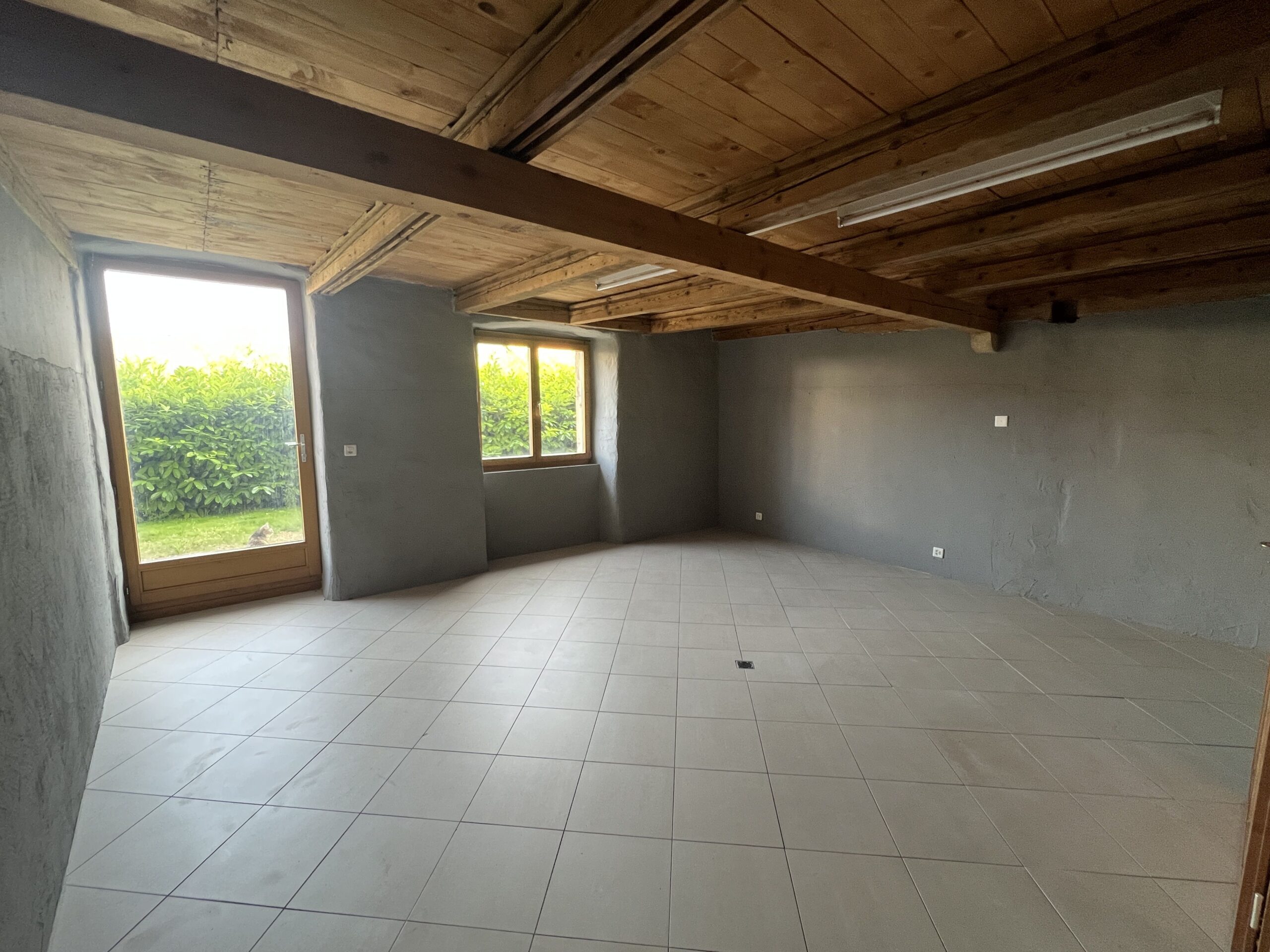 - Grande pièce à vivre : Avec un plafond en bois et des poutres apparentes, offrant un espace lumineux grâce à de grandes fenêtres.