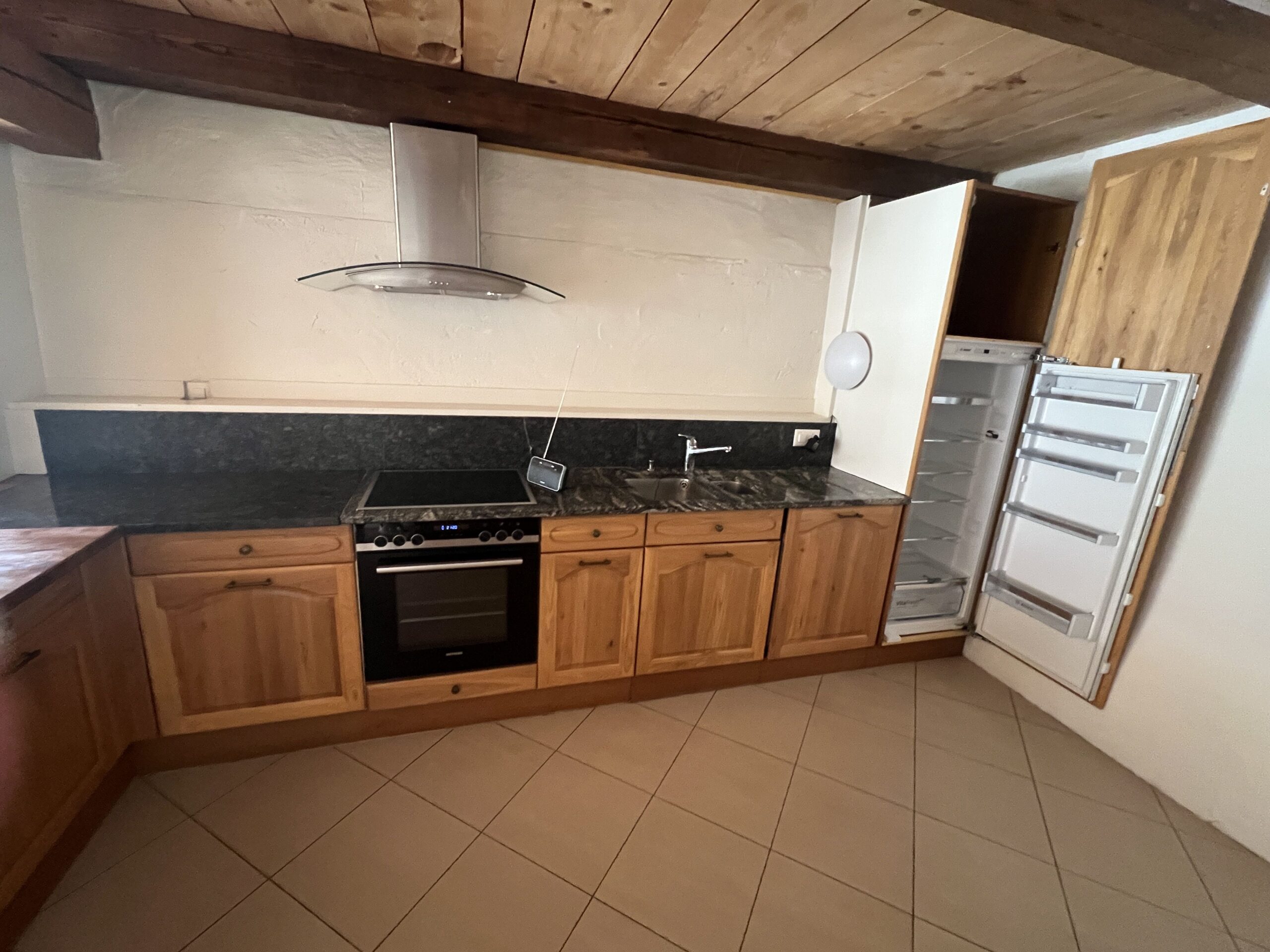 - Cuisine rustique : Équipée d'armoires en bois, d'un plan de travail en granit noir, d'une cuisinière à gaz, et d'électroménagers modernes incluant un lave-vaisselle et une machine à laver privée.