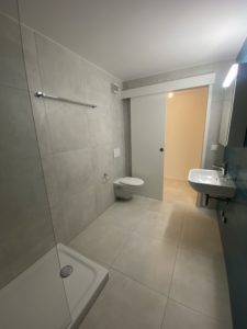 - Salle de bain spacieuse : Carrelage gris élégant, douche avec porte en verre, toilettes et lavabo.